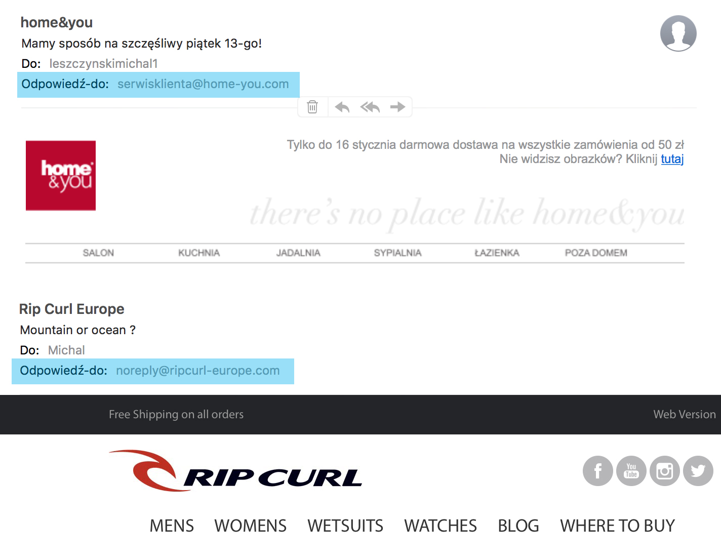 Pole odpowiedz-do marek Home&You oraz Rip Curl – która wiadomość budzi większe zaufanie?