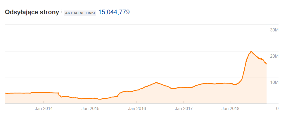 Wykres przedstawiający nagły wzrost zakładek linkujących do witryny z narzędzia ahrefs.com. Często takie zmiany wynikają z nagłego przyrostu niskiej jakości linków.