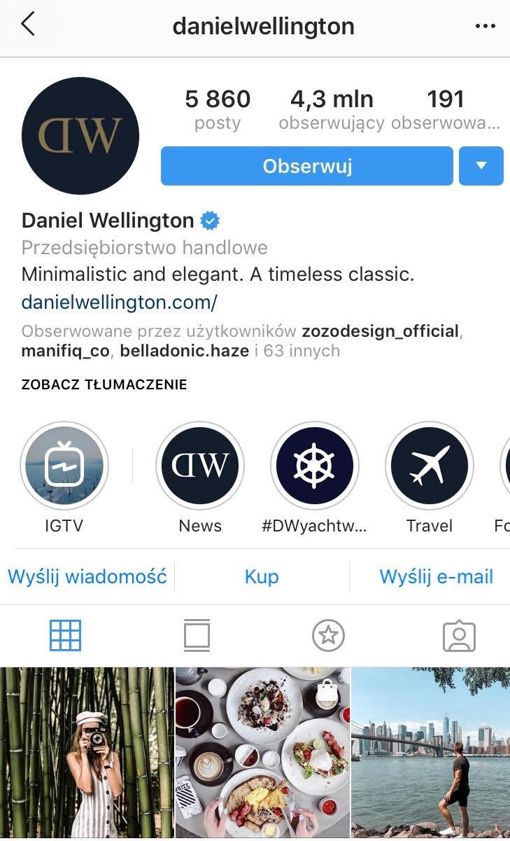 Daniel Wellington, szwedzka marka zegarków, od samego początku obecności w social media efektywnie wykorzystała potencjał influencerów, wysyłając im produkty do promocji i tym samym budując bardzo duży zasięg na platformie we wczesnej fazie launchu. Teraz, poza docenianiem fanów i nabywców produktów marki, Wellington konsekwentnie organizuje tematyczne konkursy z wykorzystaniem # i user generated content. Efektem jest już ponad 2 000 000 # z nazwą marki na platformie.