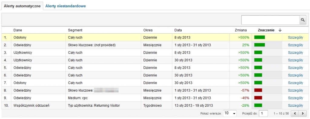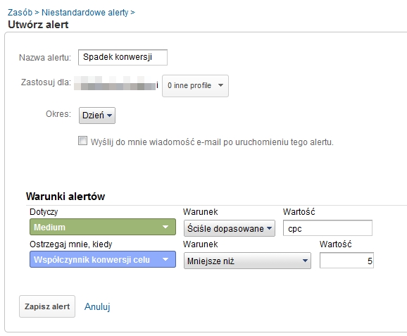 W drugim przypadku (alerty niestandardowe) sam ustalasz, jakim danym ma przyjrzeć się system. Z pewnością jest kilka wskaźników, które chciałbyś mieć pod stałą kontrolą. Po utworzeniu odpowiednich alertów nie przeoczysz żadnej istotnej zmiany w kluczowych statystykach. Dodatkowo o każdej z nich możesz być powiadamiany e-mailowo (a jeśli przełączysz się na wersję anglojęzyczną także SMS-owo). Możesz na przykład skonfigurować alert, który włączy się za każdym razem, gdy współczynnik konwersji dla odwiedzin z reklam spadnie poniżej wybranej wartości.