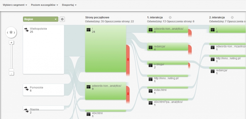 Raport w czytelny sposób pokazuje nam jakimi ścieżkami podążali użytkownicy naszej strony. Kierując kursor na dany element poznasz bardziej szczegółowe statystyki, a klikając dany węzeł (podstronę lub grupę podstron) możesz poświęcić chwilę na głębszą analizę. Dane można podzielić wg różnych wymiarów (np. regionu, źródła odwiedzin, rodzaju urządzenia).