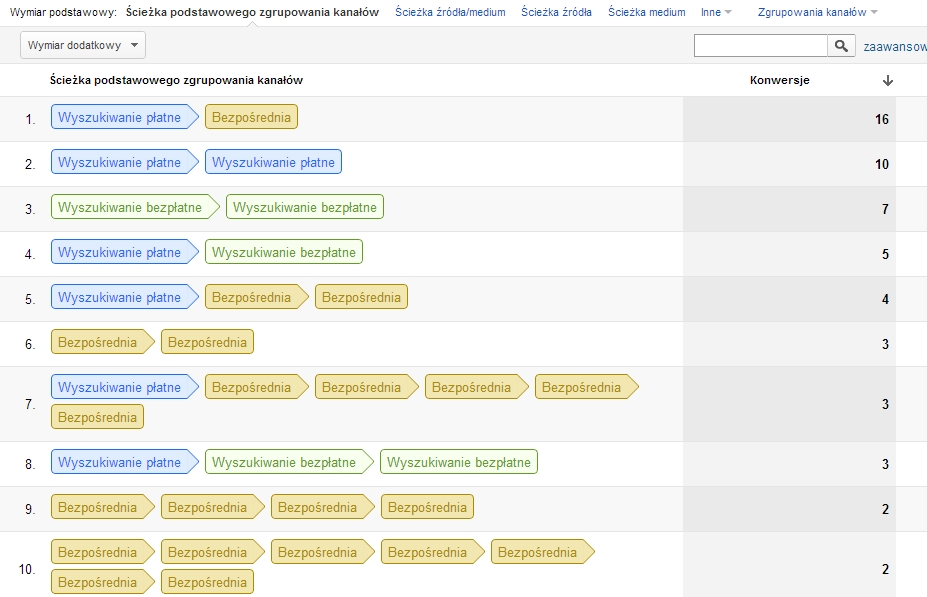 Prosta analiza konwersyjności źródeł niejednego badacza może zwieść na manowce. Dlaczego? Google Analytics standardowo przypisuje wszystkie zasługi do ostatniego źródła odwiedzin, które poprzedziło konwersję. Jak mówią Amerykanie: the winner takes it all. Tymczasem w wielu branżach droga do zakupu czy złożenia zapytania ofertowego nie jest taka prosta. Czasem zanim zdecydujemy się zamówić coś online musimy trafić na stronę przynajmniej kilka razy, porównać ofertę z konkurencją lub omówić ewentualny zakup z naszą drugą połówką. W trakcie całej tej podróży trafiamy na witryny w przeróżny sposób: za pośrednictwem wyszukiwarki, porównywarek, portali społecznościowych czy modnej ostatnio reklamy remarketingowej. Skoro tak wiele elementów bierze udział w przekonywaniu użytkownika do zakupu, powinieneś zadbać o zbadanie ich prawdziwej skuteczności. Pomogą Ci w tym raporty „Ścieżki wielokanałowe” (szukaj ich w zakładce „Konwersje”).