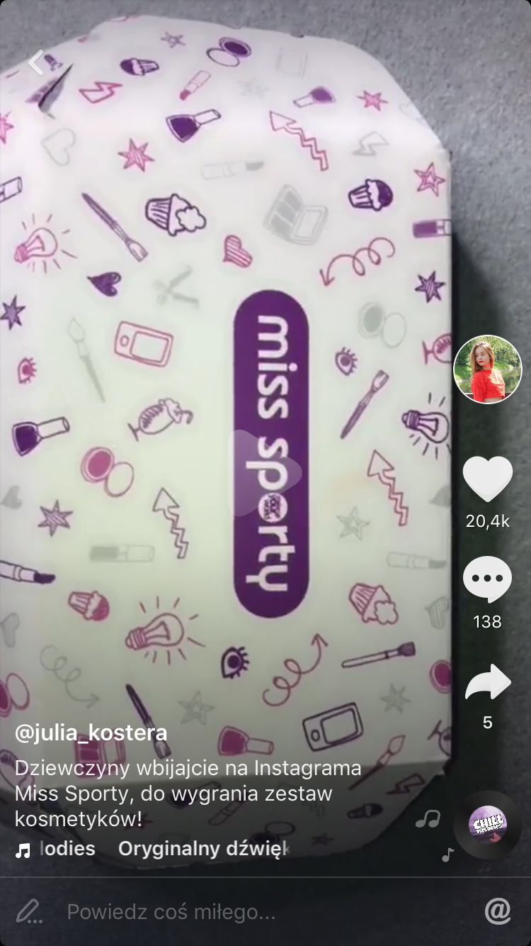 Innym przykładem współpracy marki z muserem jest film dedykowany nagrany przez Julię Kosterę dla Miss Sporty. Młoda influencerka za pomocą montażu typu transicion (forma montażu, dzięki której w krótkim czasie dzieje się wiele rzeczy przez szybkie przejścia kamery w kolejne ujęcia) przedstawiła szeroką gamę produktów marki oraz makijaż, jaki wykonała za pomocą tych kosmetyków.