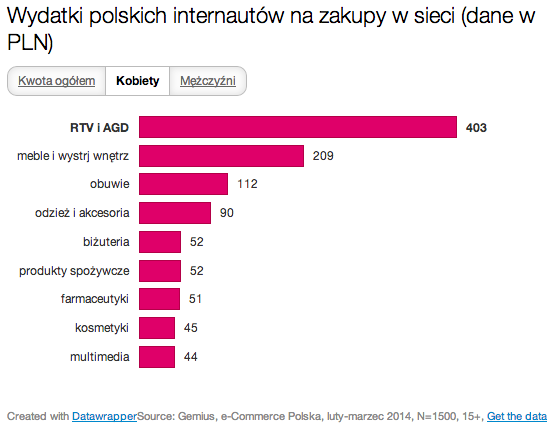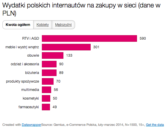 E-konsumenci wydają najwięcej na dobra trwałe, tj. sprzęt RTV/AGD (590 zł), meble i wystrój wnętrz (301 zł) oraz na obuwie (133 zł). Najmniejsze kwoty przeznaczają na produkty farmaceutyczne (49 zł), kosmetyki (50 zł) i multimedia (56 zł).