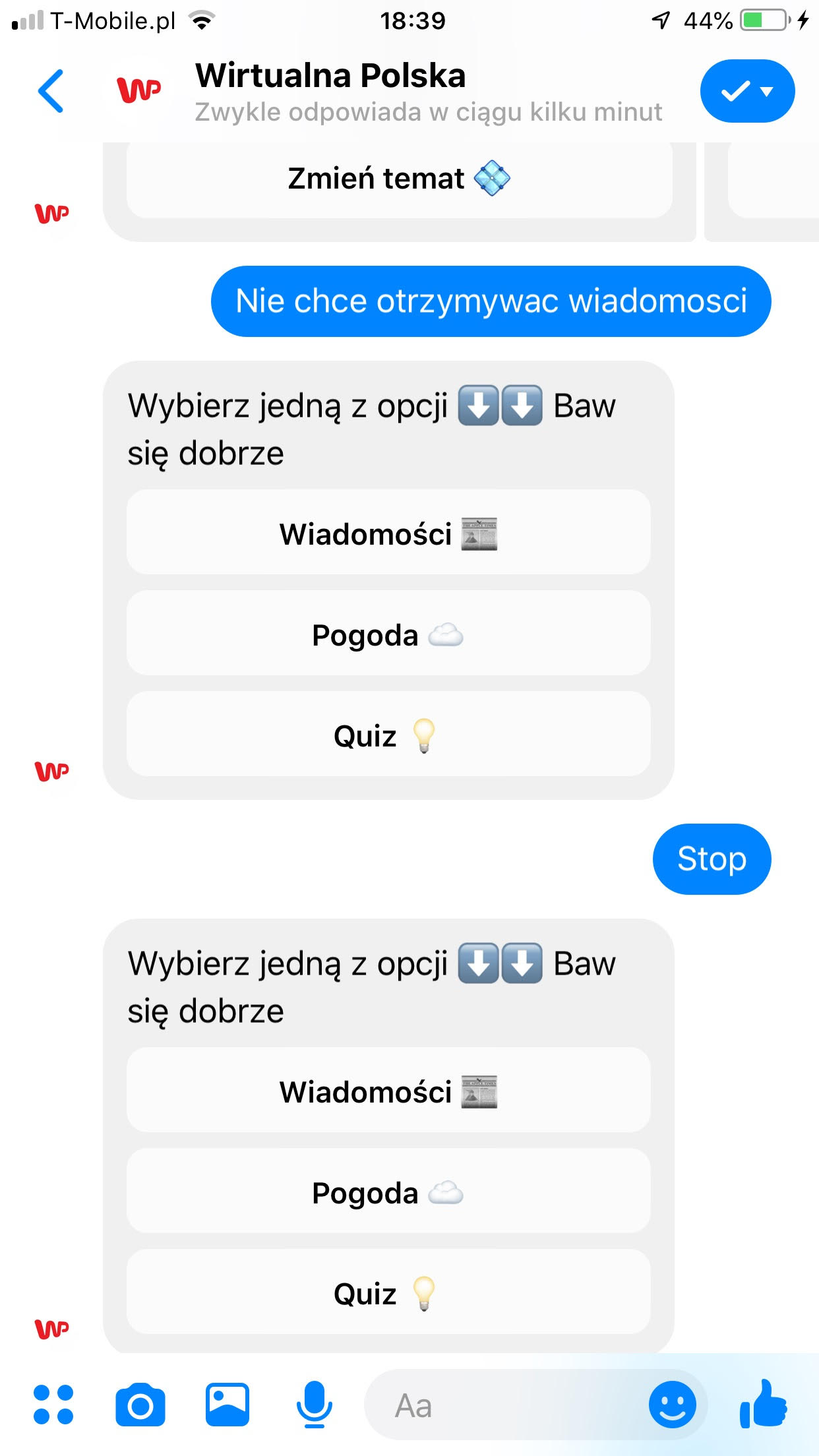Czy też odnosisz wrażenie, że masz tak dużo do powiedzenia, że nie możesz się powstrzymać? Mam wrażenie, że twórcy chatbotów czasem zapominają o specyfice kanału, w którym się znajdują. Nie chodzi o to, by koniecznie w jednej wiadomości zawrzeć wszystkie informacje o Twojej firmie, akcji, kampanii, promocji. Umiejętne rozdzielenie treści pozwoli użytkownikowi łatwiej odnaleźć się w Twoim świecie i nie przytłoczy go ilością informacji. Ponadto, jeżeli wiadomości są zbyt długie, zazwyczaj nie czytamy ich do końca. Takie czasy 🙂