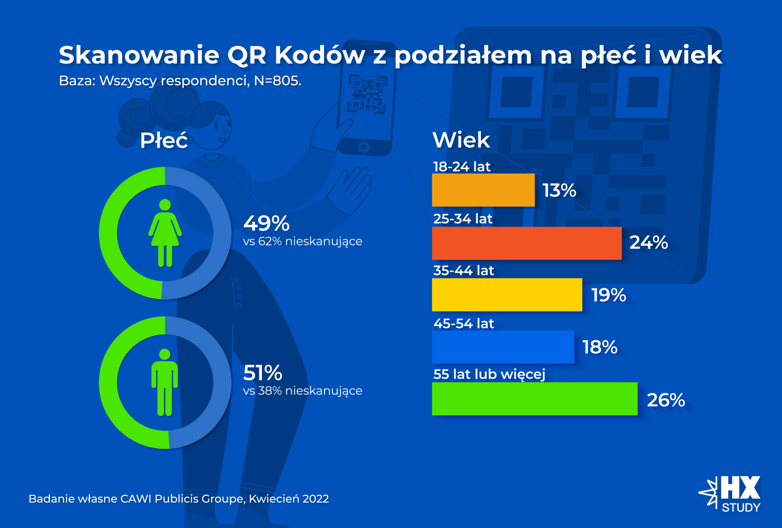 Z wyników badań opublikowanych w raporcie wynika, że aż 64 proc. respondentów deklaruje regularne skanowanie QR kodów. Nieznacznie częściej skanują mężczyźni (51 proc.) niż kobiety (49 proc.). Prawie połowa skanujących jest w wieku 25-44 lata, ale aż co czwarty ma ponad 55 lat.