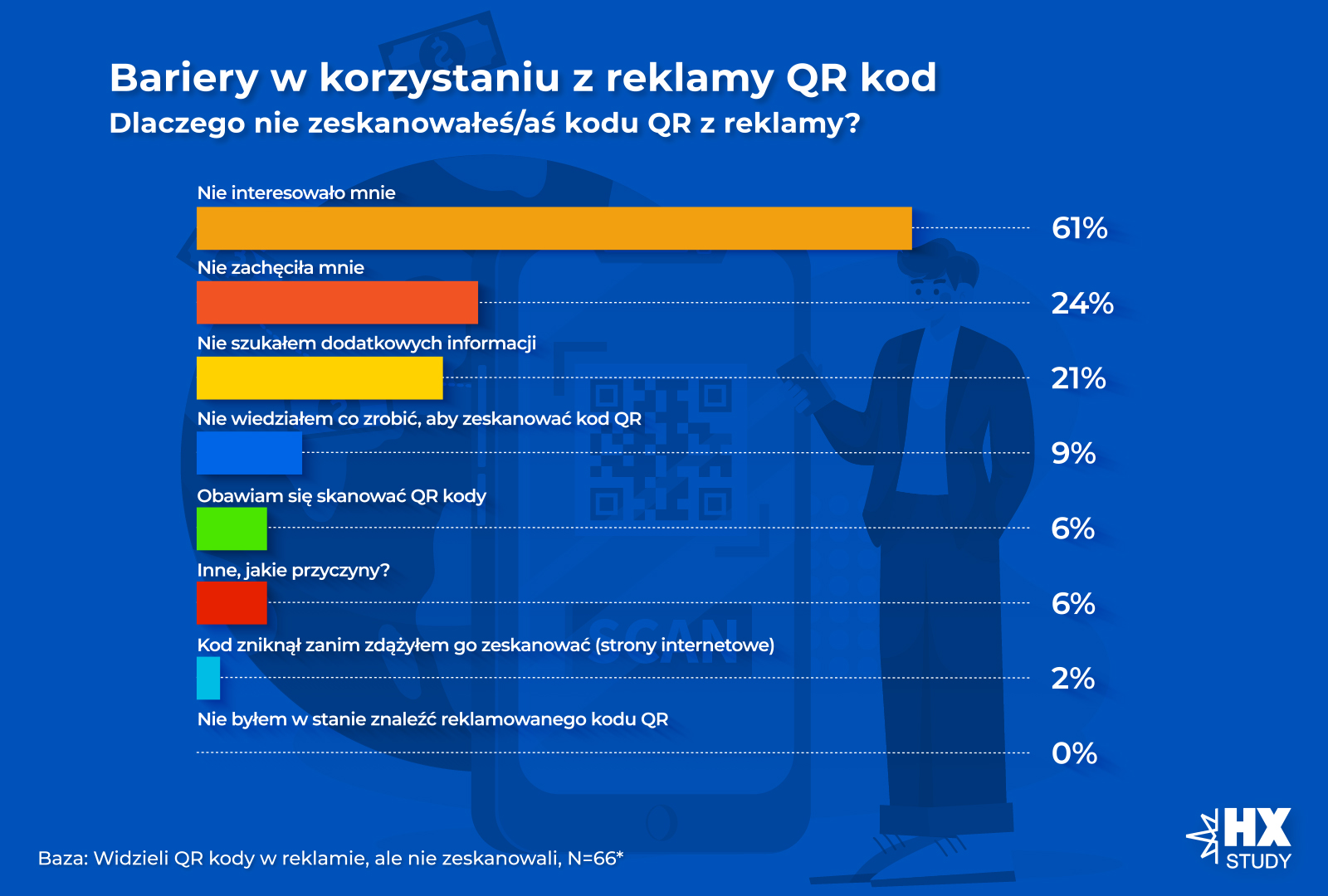 Z badań wynika, że ponad połowa Polaków (52 proc.) nie miała kontaktu z QR kodami w reklamach, a 8 proc. miała z nimi styczność, jednak nie skorzystała z kodu w reklamie. Główne bariery w skanowaniu QR kodów w reklamie to brak zainteresowania reklamą (61 proc.) lub mało zachęcająca reklama (24 proc.). Z kolei, aż 43 proc. osób, które deklaruje skanowanie kodów QR na co dzień, deklaruje, że nie miało kontaktu z reklamą wykorzystującą QR kody. Jak zatem skutecznie wykorzystać piktogramy w komunikacji reklamowej?