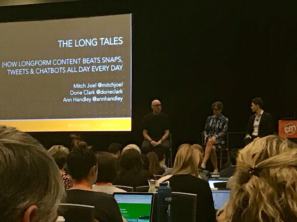 Jeśli chodzi o formy, w których tworzone są treści, najciekawsza była wg mnie dyskusja prowadzona wspólnie przez Dorie Clark (Duke University), Ann Handley (MarketingProfs) oraz Mitcha Joela (Six Pixels Group). Tematem były długie formy treści i ich znaczenie w content marketingu. Nie zawsze liczy się to, żeby opowiedzieć coś krótko i dowcipnie!