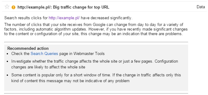Gdy widzisz nagły spadek ruchu, jest to pierwsze miejsce, w które się kierujesz. W GWT dostaniesz bowiem informację, jeśli na przykład wpadniesz w filtr (te informacje zobaczysz też w sekcji ręczne działania), lub po prostu ruch na twoją domenę znacznie się zmieni. Dla ułatwienia można ustawić sobie też przekierowanie tych wiadomości na swoją guglowską pocztę.