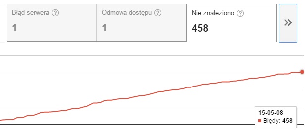 Z pulpitu nawigacyjnego możesz przejść głębiej, między innymi tutaj, by przejrzeć się, czy roboty Google trafiły na jakiś błąd, gdy przeczesywały twoją stronę. Co to może być? Na przykład błąd serwera 500 (jeśli będą się one często powtarzać, porozmawiaj ze swoim providerem), czy 404 – strony nie znaleziono (to zdarza się najczęściej przez takie głupie błędy, jak na przykład omyłkowe przeklejenie urla z kropką, ale też może świadczyć o usunięciu strony docelowej).