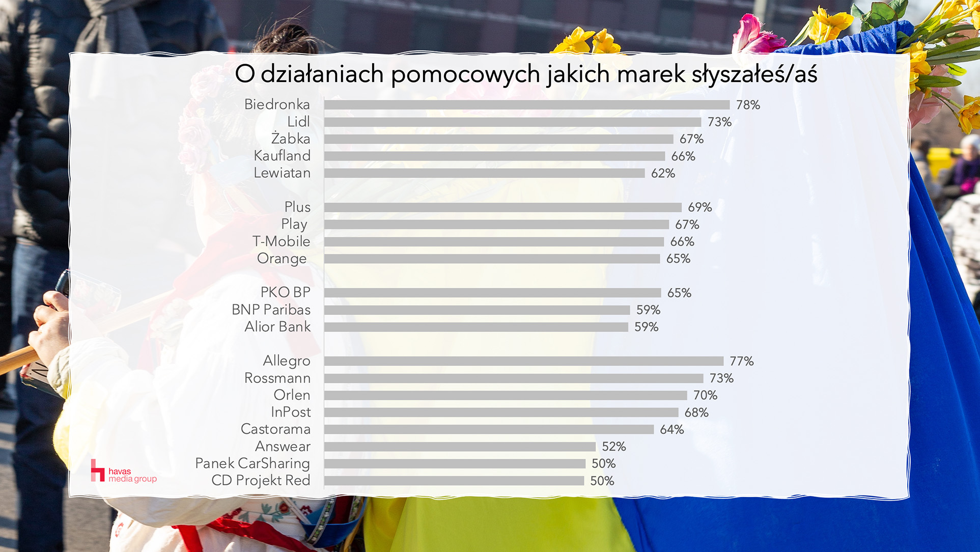 Największy odsetek badanych deklaruje, że słyszał o działaniach pomocowych prowadzonych przez markę Biedronka (78%). Badani wskazywali także znajomość akcji prowadzonych przez marki Allegro (77%), Rossmann (73%) czy Lidl (73%).