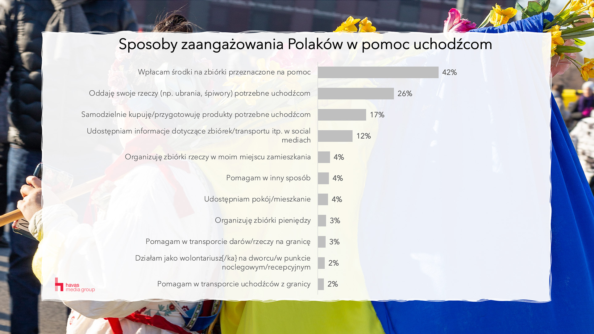 Jedna trzecia Polaków deklaruje, że zupełnie nie ma możliwości zaangażowania się w pomoc uchodźcom. Pozostali wśród rozmaitych form pomocy najczęściej wybierają wpłaty na zbiórki (42%) lub dzielenie się posiadanymi przez siebie rzeczami takimi jak ubrania, śpiwory itp. (26%). 17% badanych samodzielnie kupuje lub przygotowuje produkty potrzebne uchodźcom, a 12% aktywne działa w social mediach udostępniając informacje dotyczące zbiórek/transportu darów itp.