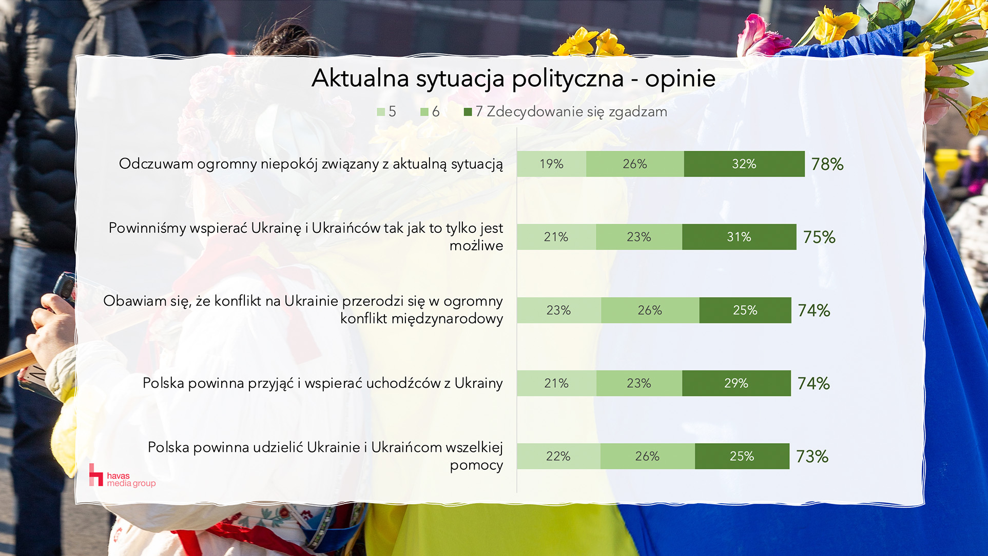 Trzy czwarte Polaków uważa, że powinniśmy wspierać Ukrainę i Ukraińców tak, jak to tylko możliwe, niemal tyle samo (74%) uważa, że Polska powinna przyjąć i wspierać uchodźców. Aż 83% badanych deklaruje pozytywny stosunek do uchodźców z Ukrainy, a niemal jedna czwarta Polaków (23%) określiła swoją sympatię wybierając na skali maksymalną liczbę punktów 10. Najbardziej pozytywne emocje wobec uchodźców żywią kobiety i osoby po 55 roku życia.