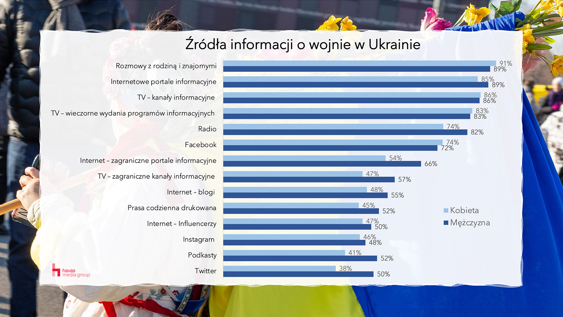 Trzy czwarte Polaków deklaruje, że w związku z wojną toczącą się w Ukrainie częściej poszukuje treści informacyjnych, pozwalających im być na bieżąco z obecnymi wydarzeniami. Częściej poszukują ich mężczyźni – wybiera je 78% z nich, wśród kobiet robi to 71%. Niewielki odsetek poszukujących informacji o bieżących wydarzeniach w porównaniu z ogółem populacji widoczny jest wśród młodych Polaków. Wśród osób przed 24 rokiem życia tylko 62% szuka treści informacyjnych – 38% częściej poszukuje treści rozrywkowych pozwalających na chwilę oderwać myśli od obecnej sytuacji.