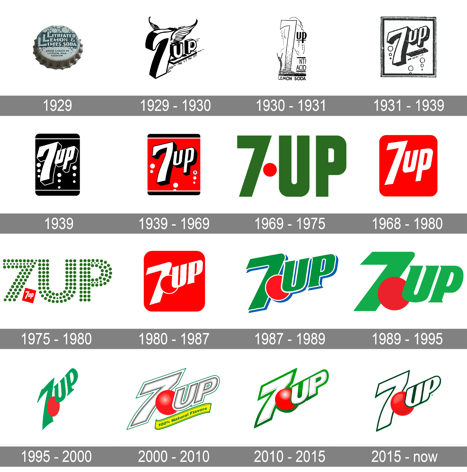 Marka 7Up zmieniała swoje logo stosunkowo często. W większości logotypów pojawiał się charakterystyczny ruch po przekątnej, co miało kojarzyć się z lekkim i rześkim smakiem napoju. W logotypach pojawiały się także inne wyróżniające elementy, takie jak np. bąbelki gazu czy skrzydła.