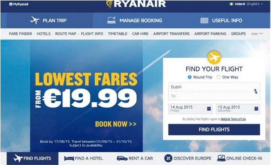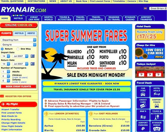 Zasady designu uległy jednak zmianie. Najlepsze strony w 2015 roku opierają się na minimalizmie, zawierają mniej kolorów i dostarczają lepszych wrażeń użytkownikom. Design ma znaczenie. Według Kissmetrics (https://blog.kissmetrics.com/leave-a-website/), 40% użytkowników nie powróci na stronę po złych doświadczeniach, a 50% okazji sprzedażowych e-commerce jest utraconych z powodu błędów w nawigacji i strukturze strony. Aby zobaczyć, jak design zmienił się w ciągu ostatnich lat, rzućmy okiem na stronę firmy Ryanair. W 2007 roku była ona zdezorganizowana, zawierała jaskrawe kolory i przytłaczającą nawigację.