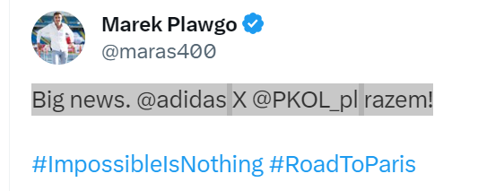 O rewolucji informuje na platformie X m.in. Marek Plawgo. Polski płotkarz, sprinter i olimpijczyk zamieścił na swoim koncie krótkie video, w którym wyraźnie widać charakterystyczne logo marki adidas, a także podpis: „Big news. @adidas X @PKOL_pl razem!”