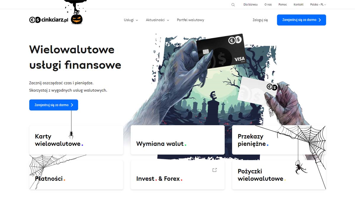 Polski serwis internetowej wymiany walut również postanowił w tym roku nawiązać do Halloween. Zamiast wymyślać kolejne video, stawiać na billboardy albo reklamy radiowe nawiązujące do święta duchów, postanowił jednak w niecodzienny sposób odmienić wygląd swojej witryny. Odwiedzający portal natkną się na pajęczyny, wystające spod ziemi dłonie zombie i wiele innych, typowo halloweenowych elementów. A wszystko to bez zbędnej przesady.
