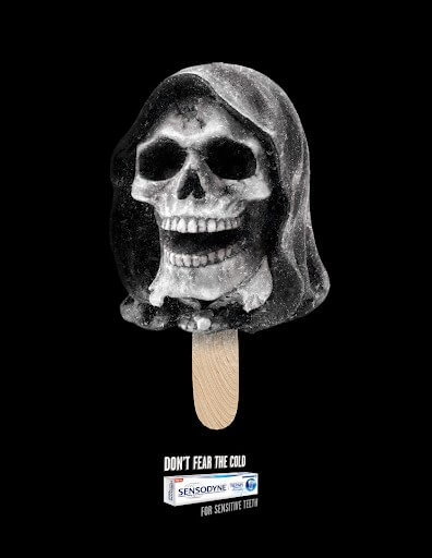 A skoro już o doskonale znanych rzeczach w nowym wydaniu mowa, tym tropem poszła też marka Sensodyne. Znana z linii past dedykowanych nadwrażliwym zębom firma, z okazji Halloween prezentuje prosty w formie i jasny w przekazie plakat nawiązujący do obawy przed uczuciem bólu towarzyszącym jedzeniu lodów. Kupujemy ten pomysł (a co niektórzy pewnie i pastę)!