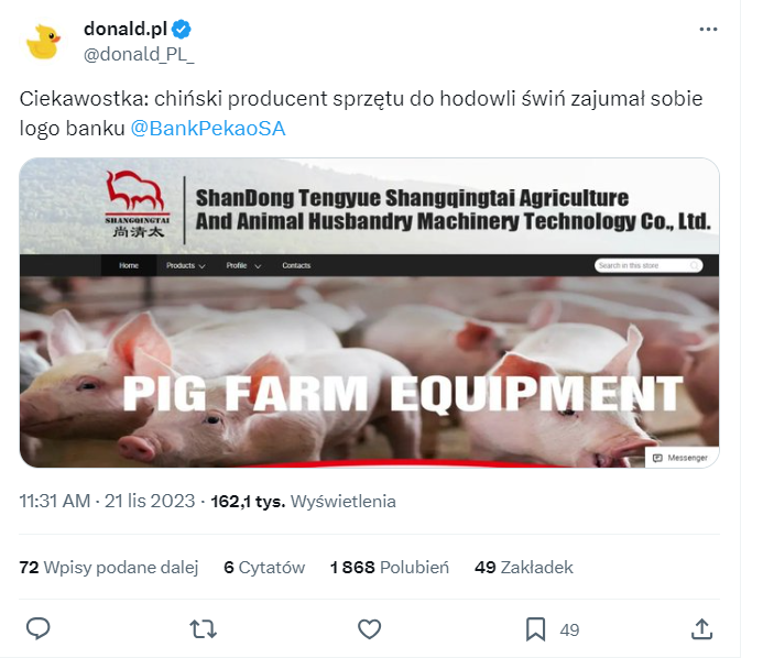 Po raz pierwszy informacja o tym, że chiński producent sprzętu do hodowli zwierząt wykorzystuje logo Banku Pekao SA, pojawiła się 21 listopada br. na platformie X (dawniej Twitter). Autor posta zauważa, że logo znane z materiałów polskiego banku w przypadku chińskiej firmy pojawia się zarówno na jej stronie internetowej, jak i w mediach społecznościowych. Okazuje się, że sytuacja trwa od kilku lat, a przedstawiciele Banku Pekao SA są go świadomi.