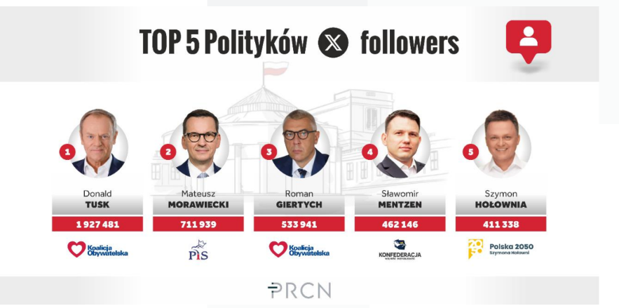 Wśród polskich polityków absolutnymi liderami w mediach społecznościowych są Donald Tusk (KO), Roman Giertych (KO) i premier Mateusz Morawiecki (PiS). Różnice w liczbie followersów pomiędzy Tuskiem a dwoma pozostałymi politykami są jednak na tyle duże (ponad 1,9 mln obserwujących Tuska przy niespełna 534 tys. Giertycha i 712 tys. Morawickiego), że można uznać, że przewodniczący Koalicji Obywatelskiej „rządzi” na X (wcześniej: Twitterze) samodzielnie.