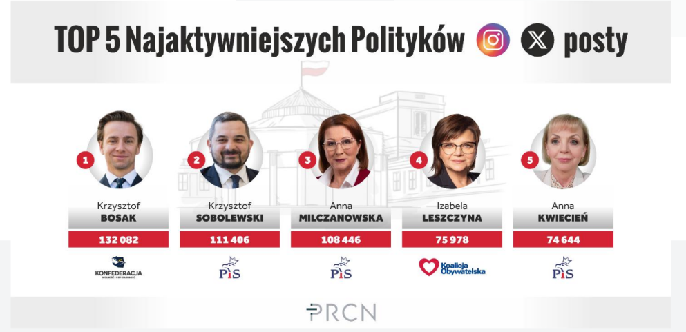 Media społecznościowe to nie tylko miejsce na wymianę poglądów czy budowanie aktywnej społeczności, ale często również platformy, na których dochodzi do słownych przepychanek. Śledzą je rzesze internautów, a zdecydowanie najbardziej aktywnym politykiem na platformach X i Instagram jest Krzysztof Bosak (Konfederacja). Bosak opublikował ponad 132 tys. postów, a plasujący się tuż za nim Krzysztof Sobolewski (PiS) niemal 111,5 tys.