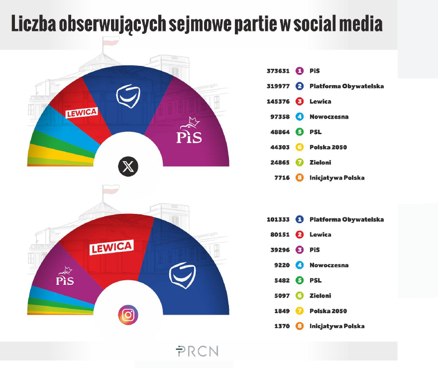 Ciekawym aspektem poruszonym w opracowaniu jest liczba osób obserwujących poszczególne partie sejmowe w mediach społecznościowych. Na X najwięcej followersów ma Prawo i Sprawiedliwość (ponad 373,5 tys.), tuż za nim jest Platforma Obywatelska (niespełna 320 tys.) i Lewica (powyżej 145 tys.).