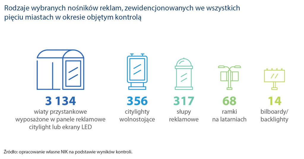 Kontrolowane miasta, poza Wrocławiem, dysponowały natomiast spisem elementów miejskiej infrastruktury wykorzystywanej do działalności reklamowej i promocyjnej, m.in. wiat przystankowych wyposażonych w panele reklamowe, słupów ogłoszeniowo-reklamowych, wolnostojących citylightów (tablic reklamowych o określonych wymiarach, zwykle podświetlanych) czy billboardów.