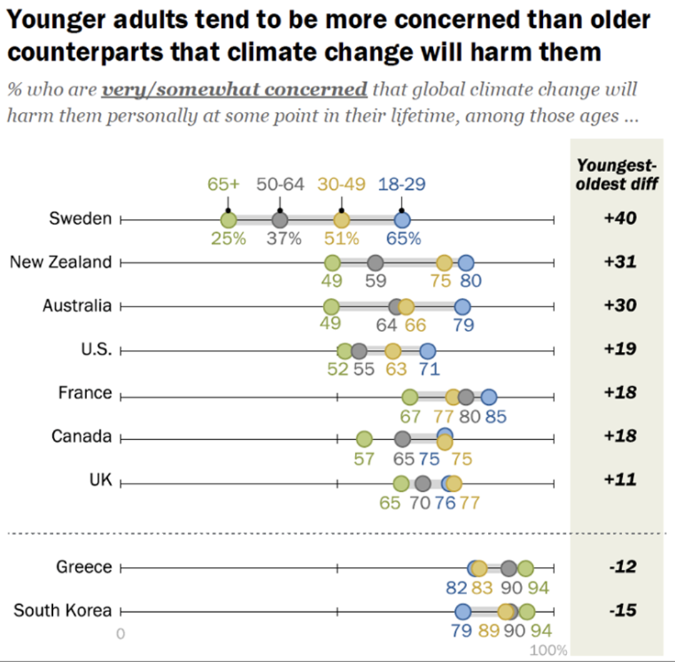 W większości państw rozwiniętych to młodzi znacznie częściej deklarują obawy przed zmianami klimatu niż starsze pokolenia. Ale z zestawu państw przedstawionego przez Pew Research Center trudno byłoby przenieść cokolwiek na polskie realia.