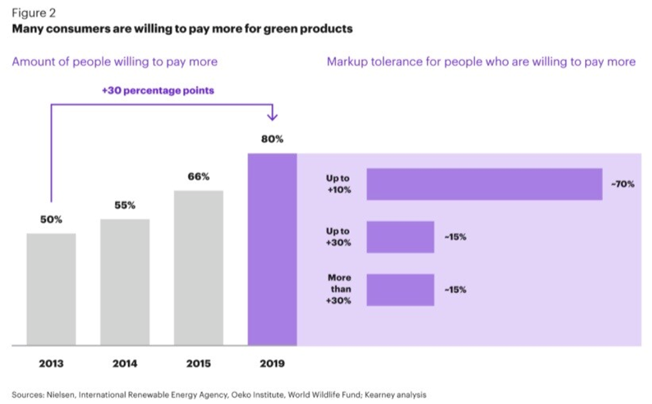 W 2023 roku w badaniach EY Future Consumer Index 60% respondentów stwierdziło, że płaci więcej za produkty zrównoważone. Jednocześnie 82% konsumentów stwierdziło, że produkty zrównoważone są zbyt drogie, a 65% że ich wysoka cena zniechęca do zakupu. Z globalnych badań zagregowanych przez Kearney wyłania się podobny obrazek do tego, który mogliśmy przeczytać w wyżej wymienionym raporcie Deloitte.