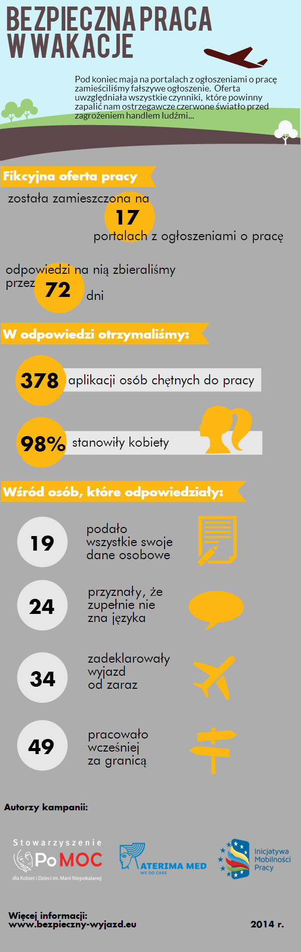 Projekt „Bezpieczna praca za granicą” rozpoczął się w 2011 roku. Jego tegoroczna, wakacyjna odsłona miała przyciągnąć uwagę osób poszukujących pracy w miesiącach letnich i sprawdzić ich świadomość zagrożenia handlem ludźmi. W tym celu pomysłodawcy projektu tuż przed wakacjami przeprowadzili eksperyment. Efekty zaskoczyły nie tylko twórców.