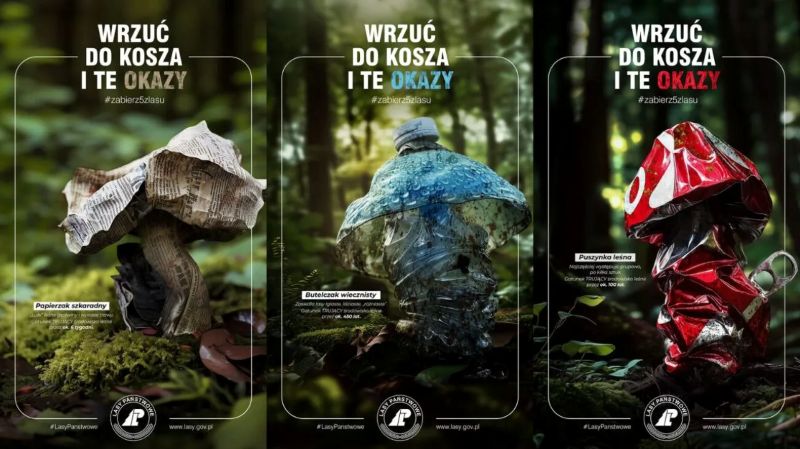Jedną z kampanii, które najbardziej zapadają w pamięć, jest akcja Lasów Państwowych #zabierz5zlasu, zachęcająca grzybiarzy do zabierania odpadów z lasów. Zgodnie ze statystykami Lasy Państwowe zebrały i wywiozły w poprzednim roku 80,6 tysiąca metrów sześciennych śmieci z polskich lasów, za co zapłaciły 32,5 mln złotych. To skłoniło do stworzenia kreatywnej kampanii zachęcającej do zabierania odpadów. Za pomocą generatywnej sztucznej inteligencji zaprezentowano kreacje z „grzybami” stworzonymi z odpadów, takie jak puszynka leśna, butelczak wiecznisty, elektrus rdzawy czy mobilek oponiasty. Biorąc pod uwagę budżet kampanii (40k PLN) było to idealne wykorzystanie genAI do stworzenia mocno oddziałujących i kreatywnych wizualizacji.