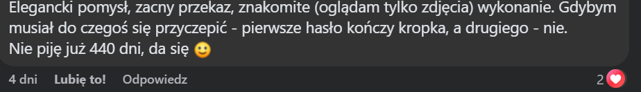 Na jednym z budynków w gdańskiej dzielnicy Wrzeszcz pojawił się mural z hasłem „Nigdy nie pożałujesz dnia, w którym przestał_ś pić”. Jego zadaniem jest dodawanie odwagi osobom, które borykają się z chorobą alkoholową lub są nią zagrożone.