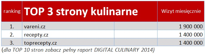 Ilość odwiedzających najbardziej znane witryny kulinarne to liczba rzędu 0,5 – 2 milionów wizyt miesięcznie. 43% pełnoletnich internautów w Czechach znajduje inspirację dla ich potraw na stronach kulinarnych. Są to nie tylko specjalistyczne strony z tej dziedziny, ale także fora internetowe, sieci społecznościowe – takie jak fanpage na Facebooku; blogi kulinarne oraz krótkie instruktaże na kanale YouTube czy nawet aplikacje mobilne, które uzupełniają lub zastępują klasyczne książki kucharskie.