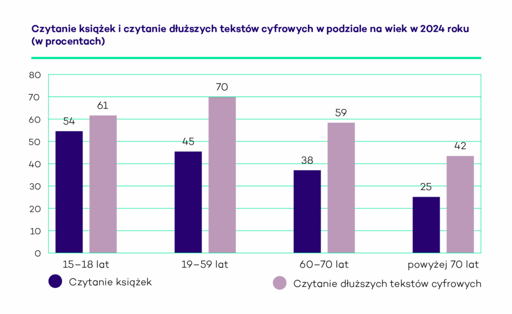 Wśród młodzieży czytanie w 2024 roku zadeklarowało 54% pytanych, a na przeciwległym biegunie pod tym względem uplasowali się seniorzy. Zaledwie 25% osób powyżej 70. roku życia przeczytało w 2024 roku książkę.