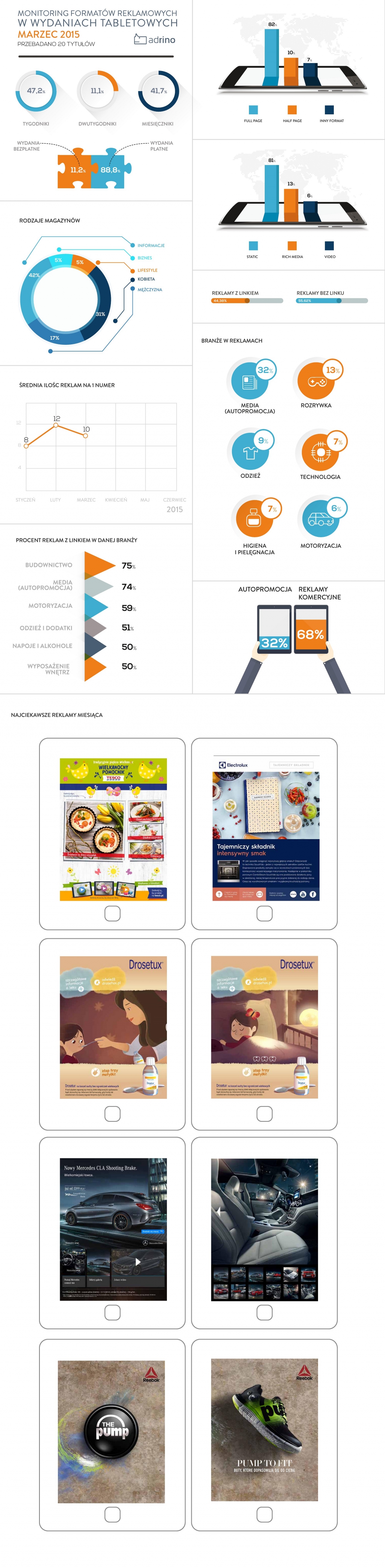 Marzec nie różnił się znacząco od lutego liczbą reklam autopromocyjnych – nadal ich stosunek wynosi 2/3 do 1/3 (komercja vs. autopromocja). „Liczba ta pokazuje jednak, że wydawcy nadal czują silną potrzebę promowania swoich innych e-wydań.” – komentuje ten fakt Weronika Gładych, Account Manager, w adrino odpowiedzialna za reklamę w wydaniach tabletowych.