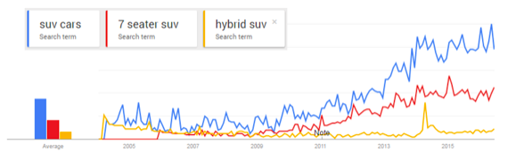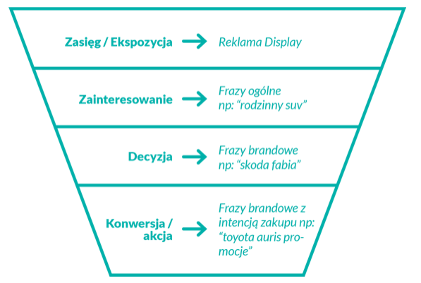 Przed wystartowaniem kampanii należy sprawdzić potencjał rynku i jego poszczególnych grup produktów. Na przykładzie rynku australijskiego widać, jak zachowują się konsumenci, którzy poszukują ogólnych informacji na temat samochodów SUV (sport utility vehicle), następne zawężając swoje poszukiwania do coraz bardziej precyzyjnych zapytań. Ukazuje to zasadę lejka – od dotarcia do większej grupy odbiorców (słowa typu „suv cars”) poprzez zawężane kategorii i grupy odbiorców słowami bardziej precyzyjnymi, schodząc tym samym ku końcowi lejka, aż do konwersji użytkownika.