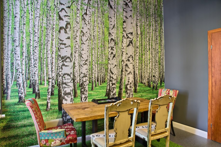 Nasze biuro cechują elementy typowe dla stylistyki Mediakraft: szare ściany, białe okna oraz listwy podłogowe, czerwona podłoga, fototapety z elementami natury, kolorowe meble, fantazyjne akcesoria. Razem stanowią one wyważone połączenie stylu vintage z nowoczesnością.