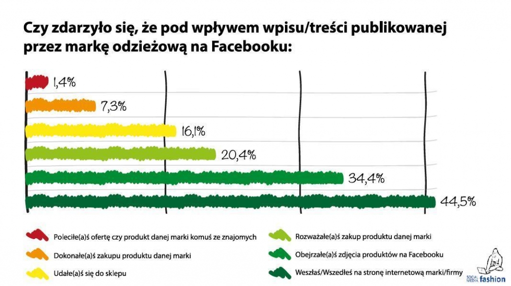 Wyniki badania przedstawione w raporcie wskazują, że skuteczność działań sprzedażowych na Facebooku w odniesieniu do produktów odzieżowych może być bardzo duża. Wpisy na Facebooku publikowane przez producentów odzieży są dla użytkowników Facebooka wiarygodnym źródłem rekomendacji i sugestii powodujących często różne aktywności. Ponad 7% fanów stron marek fashion deklaruje, że zdarzyło im się kupić jakiś produkt pod wpływem wpisu w serwisie.