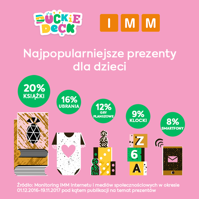 Wyniki monitoringu Internetu i mediów społecznościowych opracowane przez IMM wskazują, że najwięcej publikacji w sieci dotyczy poszukiwania pomysłów lub dzielenia się inspiracjami odnośnie prezentów dla dzieci. Około 42 proc. wszystkich publikacji zawierających wzmianki o prezentach dotyczy upominków dla najmłodszych. Dalej popularne są zestawienia pomysłów na prezenty dla mamy, chłopaka, babci, dziadka i taty.