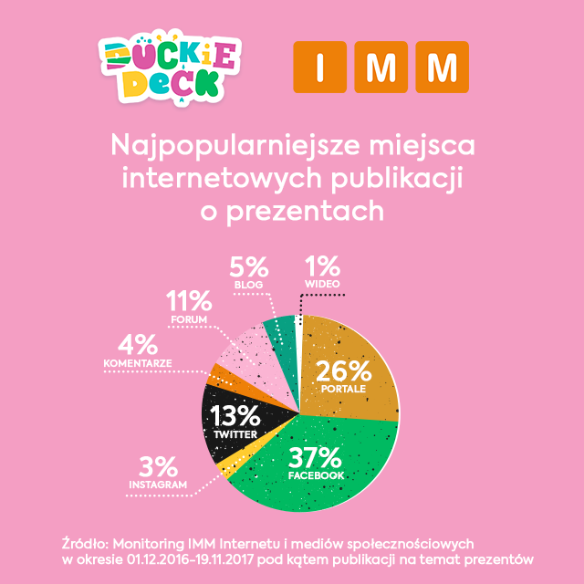 Według danych IMM w listopadzie 2017 roku w Internecie i mediach społecznościowych powstało 10,5 tysiąca publikacji na temat prezentów, z czego jedynie 1,4 tysiąca dotyczyło prezentów dla dzieci. W tym okresie najwięcej treści tego typu powstało na Facebooku, Google+ oraz Instagramie. Natomiast jeśli chodzi o najaktywniejsze źródła publikacji, to poza mediami społecznościowym należy wymienić wizaz.pl/forum oraz portal babyonline.pl.