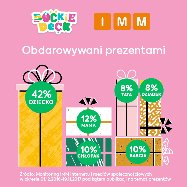 O badaniu: Badanie wykonano na podstawie danych z monitoringu IMM Internetu i mediów społecznościowych w okresie od 1 grudnia 2016 do 19 listopada 2017 roku. Dane dotyczyły materiałów zawierających wzmianki o prezentach, z uwzględnieniem dodatkowych kontekstów (dla kogo prezent, jaki prezent, prezent dla dziecka itp).