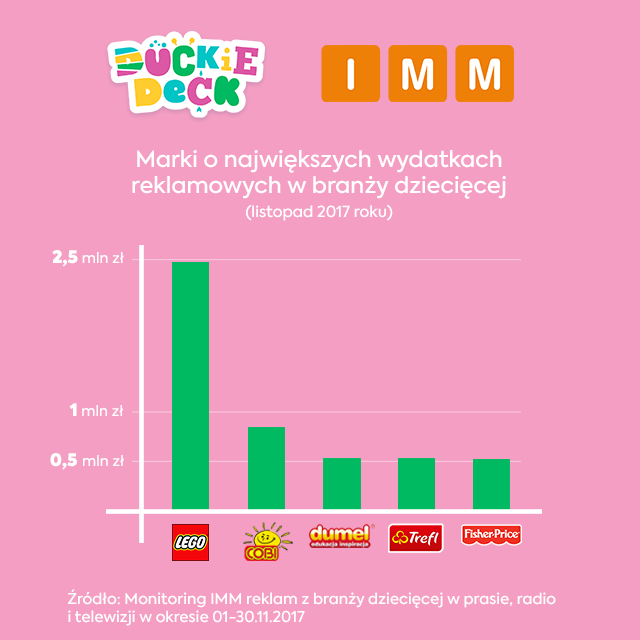W listopadzie 2017 roku największe wydatki na promocję w telewizji, radiu i prasie przeznaczyły marki Lego, Cobi, Dumel, Trefl i Fisher Price.