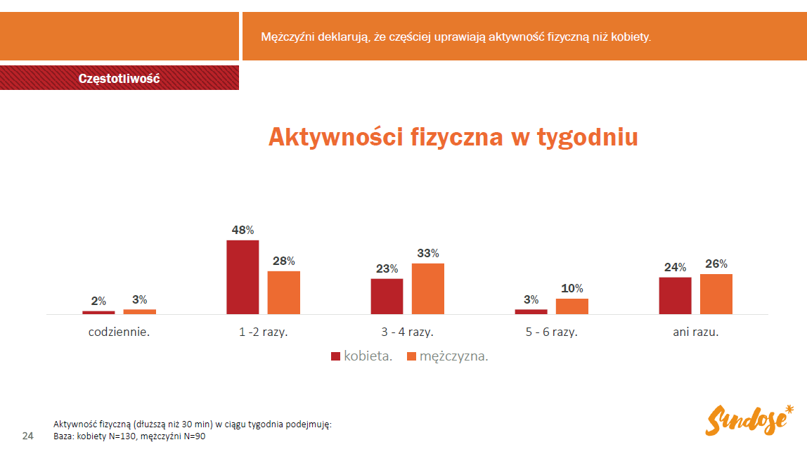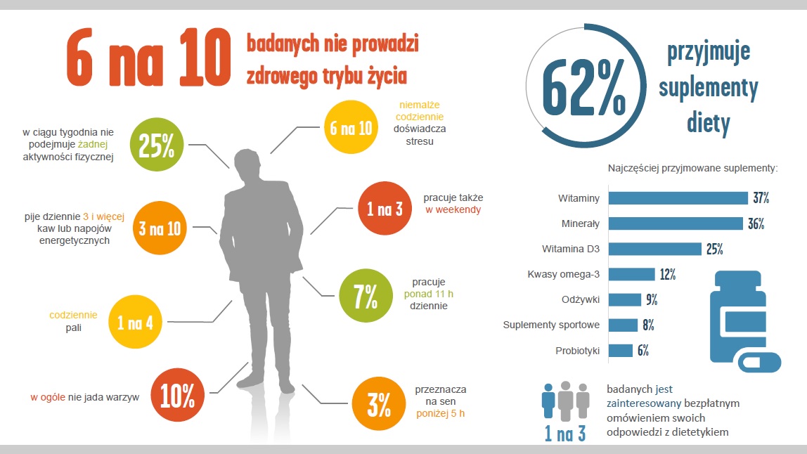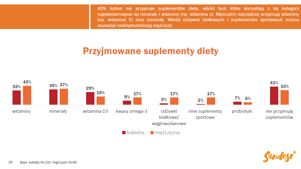 Witaminy, minerały i kawasy omega-3 to najpopularniejsze suplementy w badanej grupie. 40% kobiet nie przyjmuje suplementów diety, wśród tych, które korzystają z tej kategorii najpopularniejsze są minerały i witaminy (np. witamina c). Mężczyźni najczęściej przyjmują witaminy (np. witamina C) oraz minerały. Wśród odżywek białkowych i suplementów sportowych można zauważyć nadreprezentację mężczyzn.