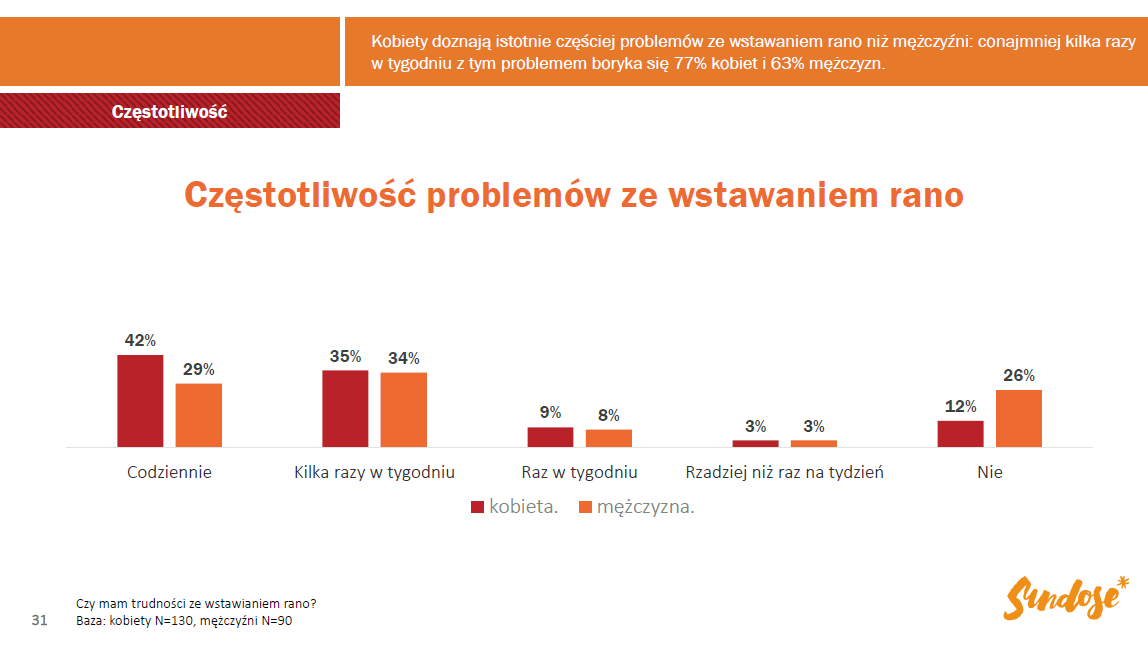 Spora część ankietowanych deklaruje duży problem z porannym obudzeniem się. Ponad 70% ankietowanych wskazuje, że ma problemy ze wstawaniem rano co najmniej kilka razy w tygodniu. Co ciekawe, większy problem z poranną drzemką mają kobiety.