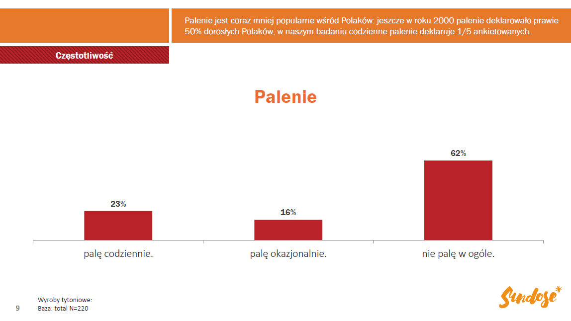 Ale są również powody do dumy. Marketerzy zdecydowanie unikają palenia papierosów. Palenie jest coraz mniej popularne wśród Polaków: jeszcze w roku 2000 palenie deklarowało prawie 50% dorosłych Polaków, w naszym badaniu codzienne palenie deklaruje 1/5 ankietowanych.