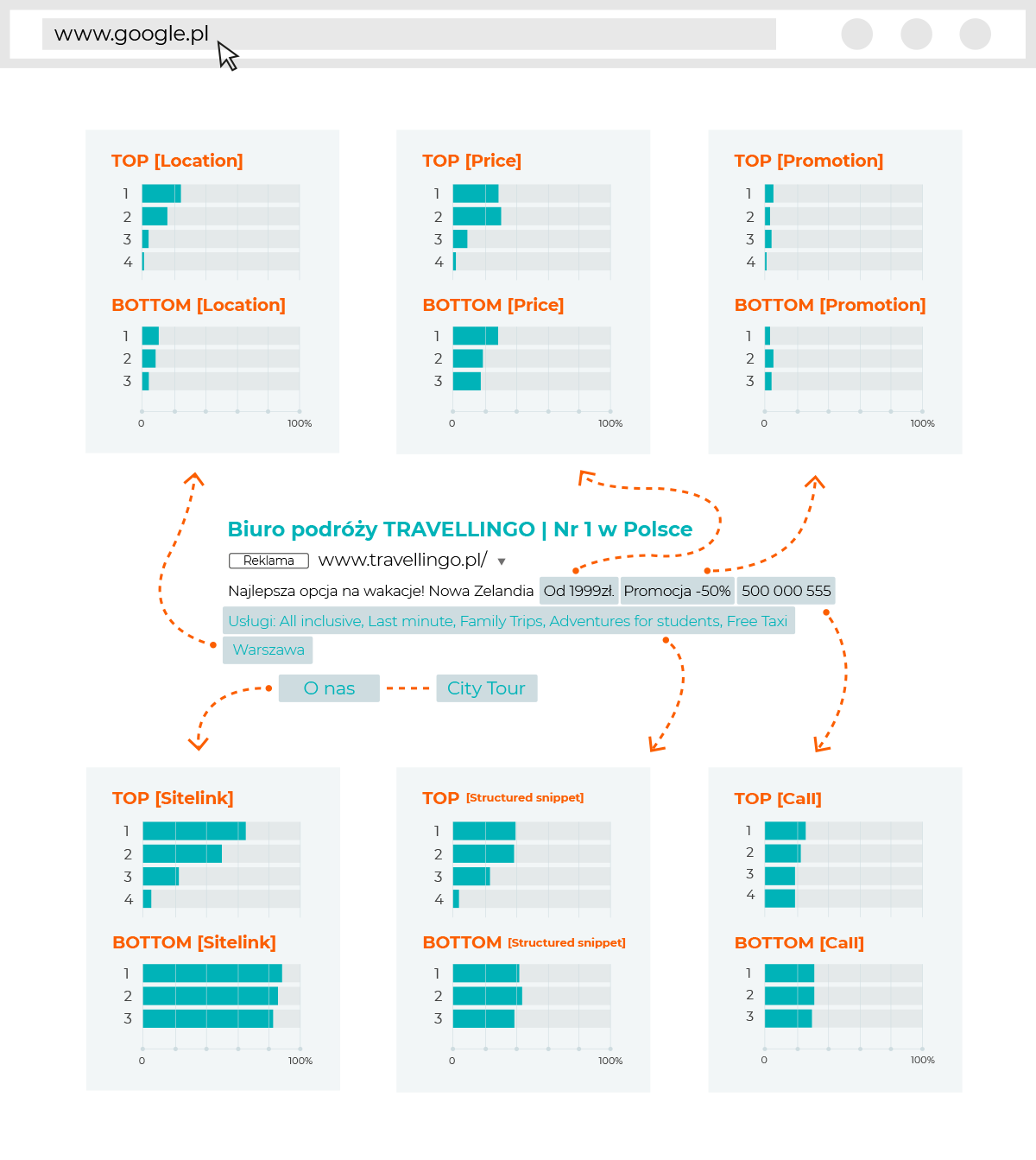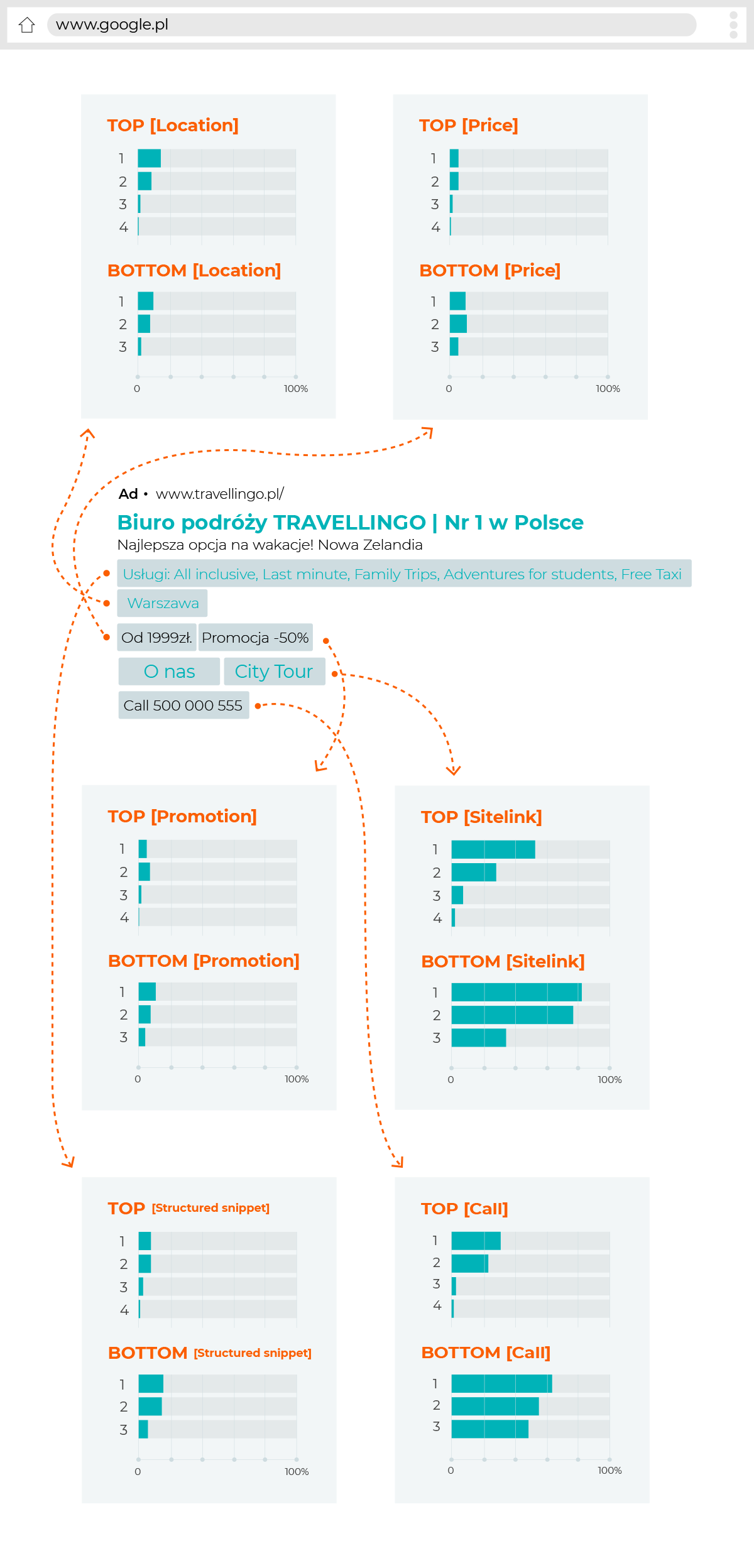 W tekście reklamy wyróżniliśmy konkretne rozszerzenia, a ich udział procentowy w danej pozycji w wyszukiwarce przedstawiliśmy za pomocą wykresów (oddzielnie dla reklam pojawiających się na górze wyszukiwarki – „top” i oddzielnie dla reklam na dole wyszukiwarki – „bottom”).