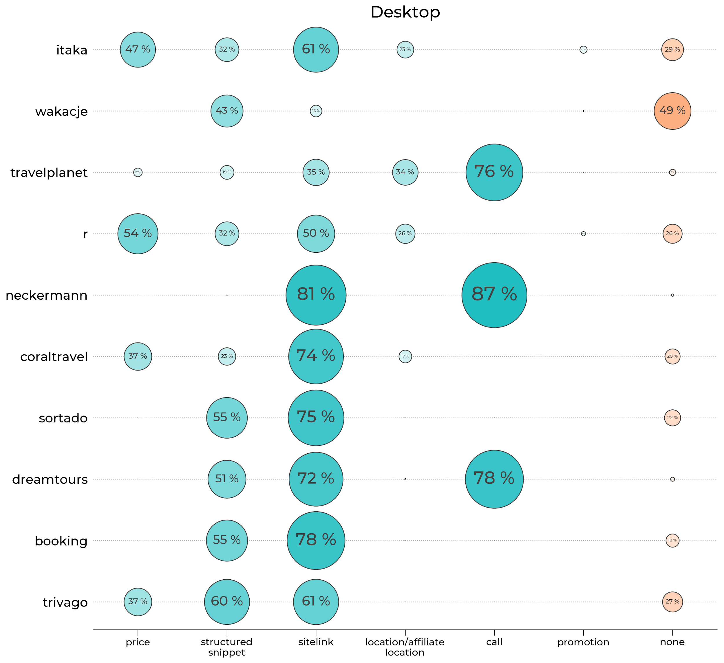 - Coral Travel zdecydowanie częściej pojawiał się na desktopie niż w wynikach mobilnych, a serwisy Sortado i Travelist skupiły się praktycznie wyłącznie na desktopie. Z kolei Neckermann był bardziej widocznych na urządzeniach mobile niż stacjonarnych (ok. 58 % więcej). Podobne proporcje zaobserwowaliśmy w przypadku Dreamtours i Fly.