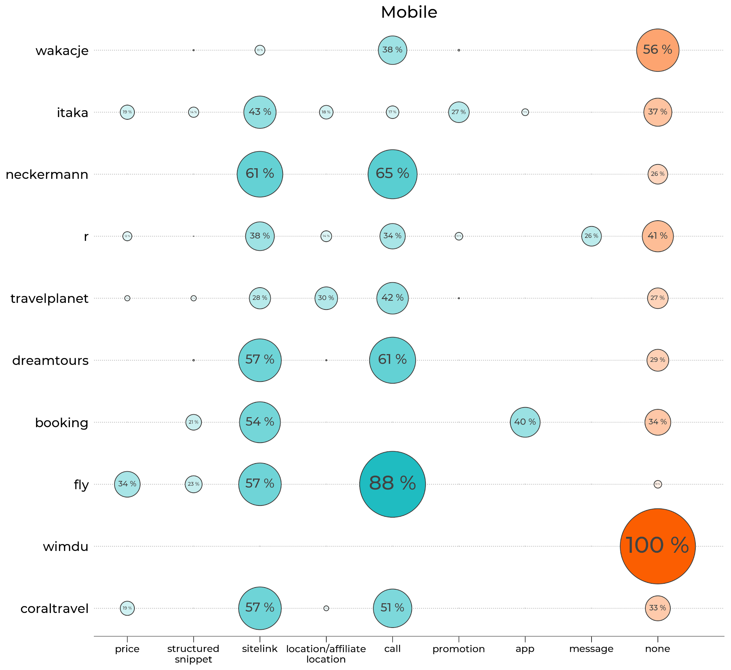- Wyniki pokazują, że podczas trwania analizy większość topowych graczy chętnie inwestowała w rozszerzenia sitelink. Neckermann skupiał się na sitelink i call, a domena Fly.pl opierała większość komunikacji o rozszerzenie call.
