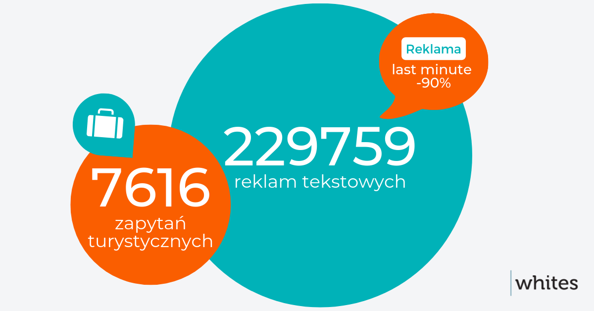 W ramach naszej analizy pobraliśmy dane dla 7616 zapytań turystycznych i blisko 230 tysięcy reklam tekstowych. 94% wyników na badane frazy kluczowe zawierało wyniki płatne.